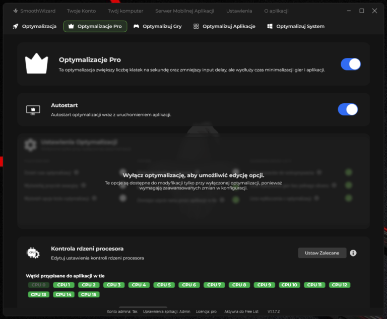 - Dostęp do ustawień Optymalizacji Pełnoekranowej PRO